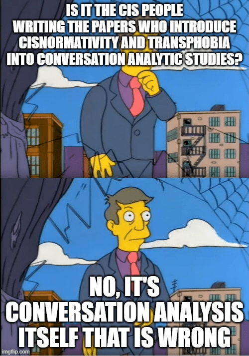 While working on something else, I have found myself finally actually reading some of the conversation analytic research by Speer and colleagues on interactions between psychiatrists and trans people in a UK gender identity clinic. I’ve been aware of these studies for a looong time but have not really paid attention to them. I have at various points skimmed the data extracts before determining that the paper was clearly taking the clinician’s side and neutralising the ickiness of psychiatry’s treatment of trans people. And, yeah, I was right. And I’m not the only one to note this. But actually taking a look at them for realsies recently, I’m quite confronted by the actual degree of their obvious (gender) troubles, from presumptive cisnormativity on the one hand to explicit antagonism of trans people on the other.